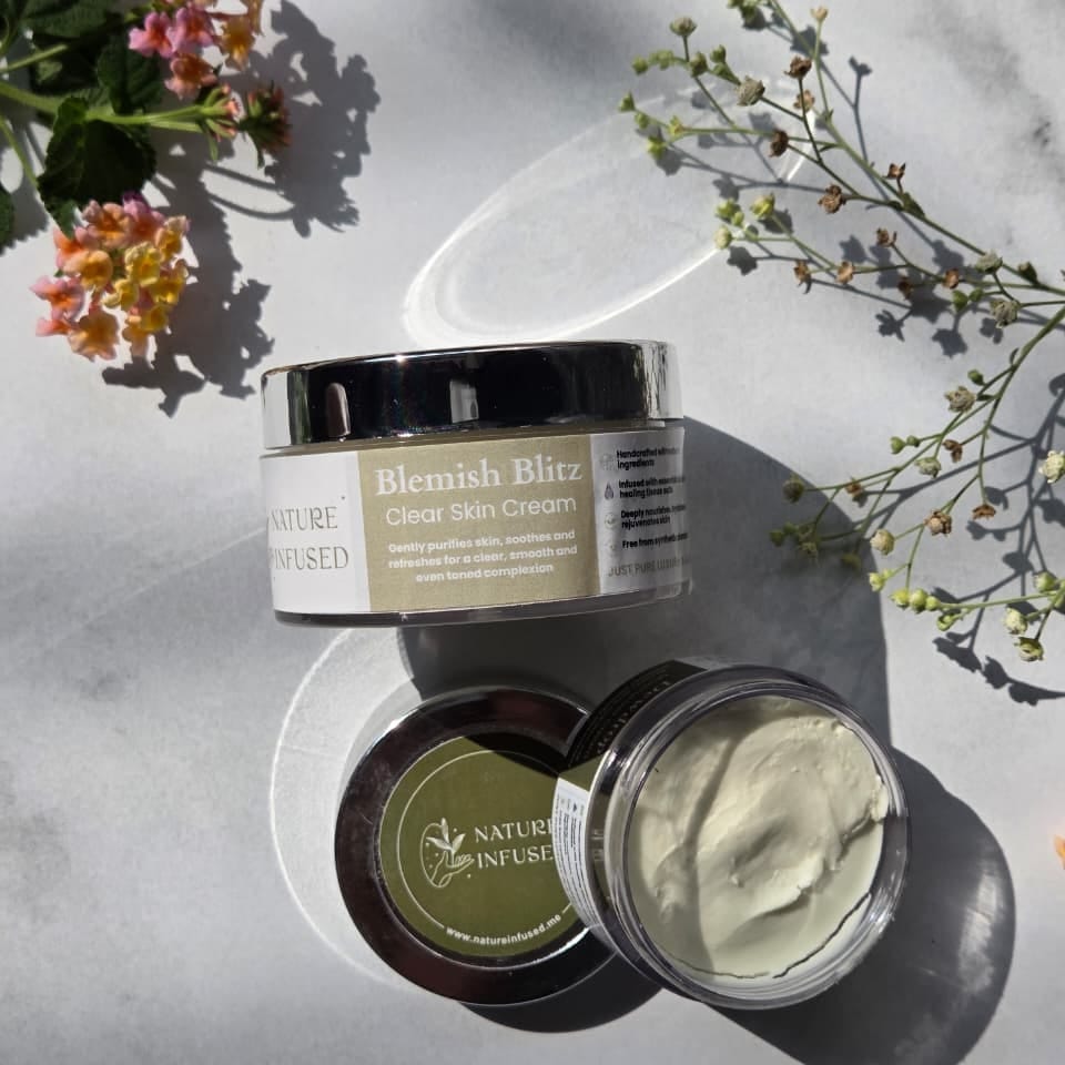 Blemish Blitz is a handcrafted fusion of aloe, kokum butter, tea tree oil, almond oil, neem extract, glycerine, and nature-inspired mineral essences.